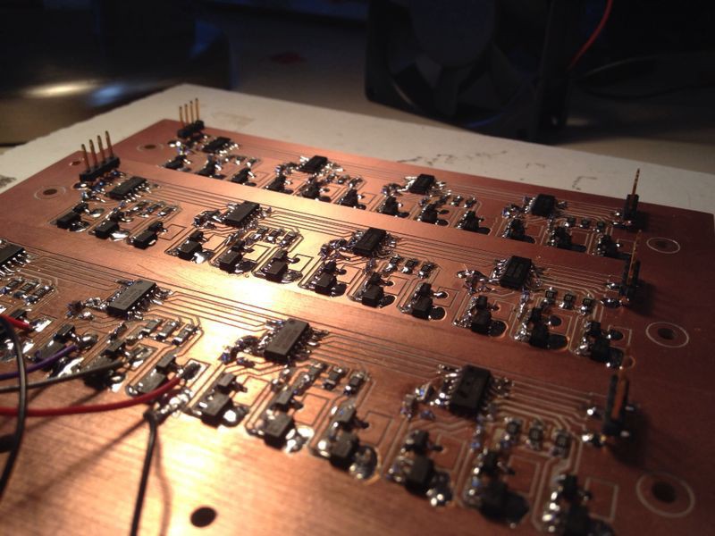 Bauteile: Atmega328 + SN7517 + 12x WS2801 + 36x AMC7135 + 36x TSM2302 + 12V/350Watt Netzteil + 2x Lüfter
