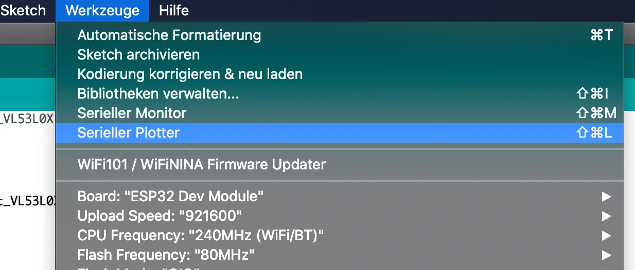 Um den Serial Plot Monitor in Arduino IDE zu öffnen einfach über den Menüpunkt “Werkzeuge” -> “Serieller Plotter öffnen”.