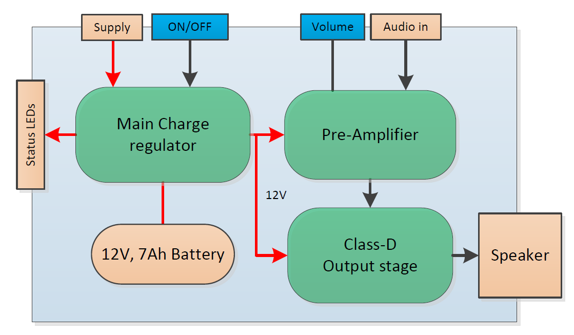 Bauteile: 2x 60W Breitbänder, 2x Hochtöner, 12V/7Ah Bleiakku, 2x15W Class-D Stereo Verstärker,