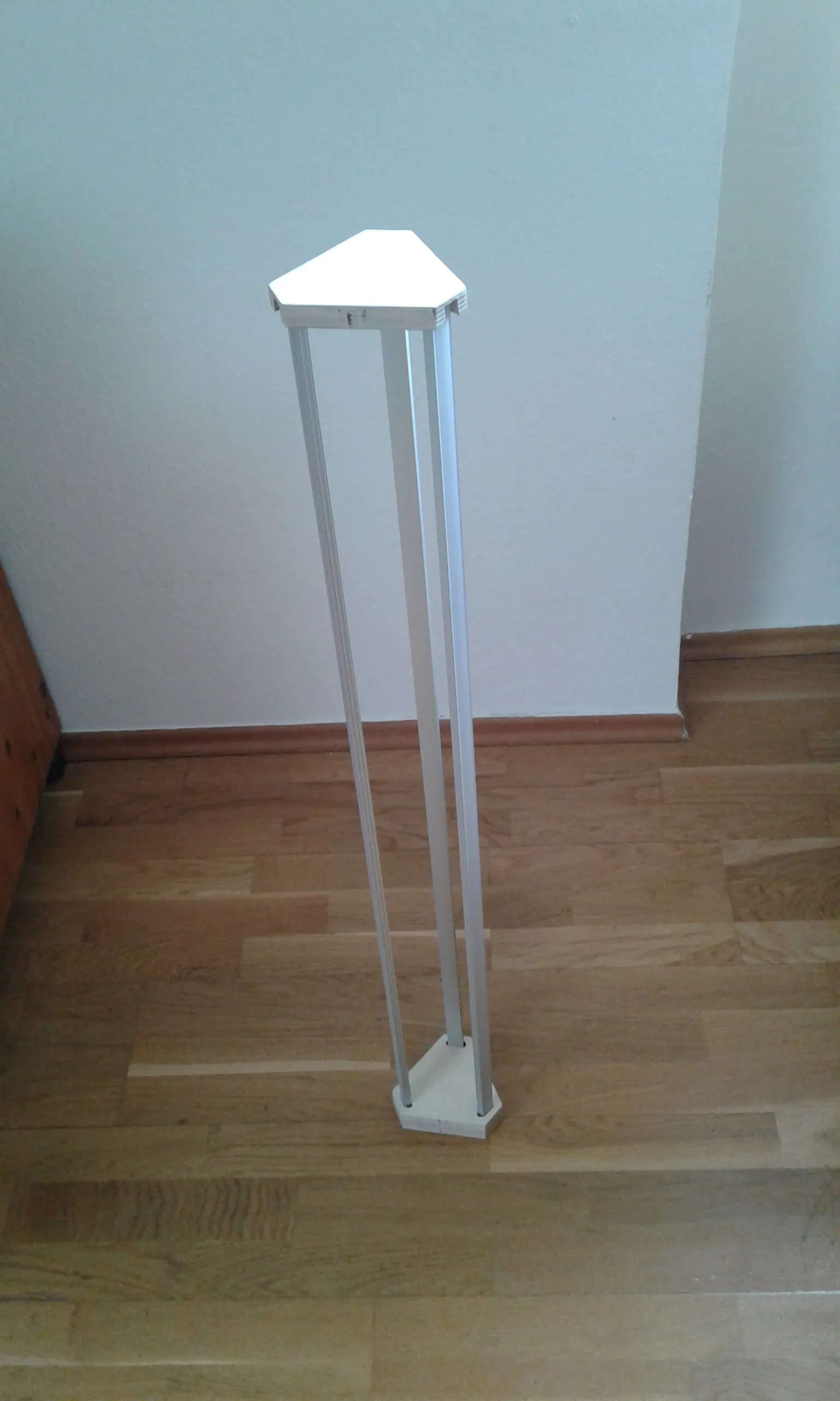 Die Elektronik verschwindet zwischen zwei gefrästen Holz Halb-Schalen im Sockel. Die drei Alu-Leisten sind mit dem Holz verschraubt.